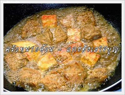 3.นำลงทอดในน้ำมันไม่ต้องมาก ทอดไฟอ่อนๆให้เต้าหู้ตีงๆตัวทั้งสองด้าน แล้วเติมน้ำลงไปเคี่ยวไฟอ่อนๆไปเรื่อยๆ ถ้าน้ำงวดไปแล้วครั้งนึงให้เติมน้ำไปอีกรอบนึง