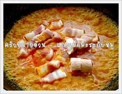 3. ใส่หมูสามชั้น ผัดให้เข้ากันปรุงรสด้วย น้ำตาลปี๊บ น้ำปลา ถ้าน้ำพริกแห้งไปก็เติมกะทิได้