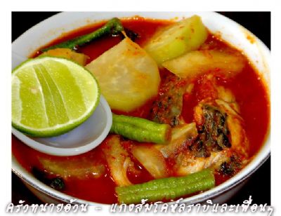 2. เอาน้ำพริกแกงส้มใส่ครกแกะเนื้อปลาใส่ลงไปแล้วตำให้เข้ากัน แล้วนำลงละลายในหม้อที่ต้มหัวปลา