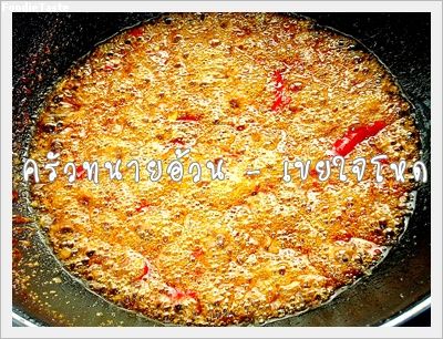 Season with sugar, fish sauce and tamarind juice. Simmer over medium heat until thick (The bubbles come out in the same size). Add holy basil leaves and turn off the heat.