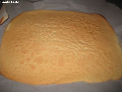 ปั่นน้ำตาลทรายกับไข่ให้ขึ้นฟู เติมแป้งสาลี ผงฟู น้ำเปล่า ผสมให้เข้ากัน เทใส่ถาดแบนๆ ที่รองกระดาษไขไว้แล้ว เข้าเตาอบไฟ 200 องศาเซลเซียส เวลา 5 นาที