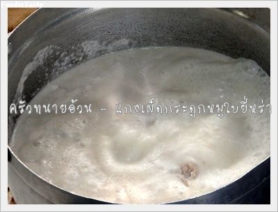 2.ใส่น้ำพริกแกงเผ็ด คนให้ละลายจนหมด เคี่ยวไฟอ่อนๆต่อ จนกว่าจะเผ็ดเข้าเนื้อ