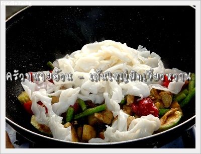 4. ใส่เส้น ผัดให้เข้ากัน แล้วโรยพริกชี้ฟ้า นมข้นจืดลงไปผัดให้เข้ากันอีกที ก็ปิดไฟได้