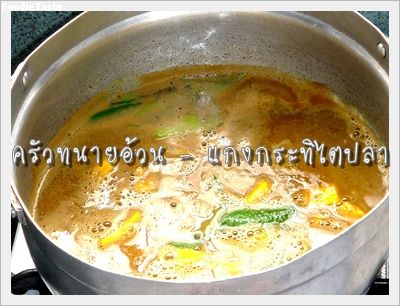 4. ปรุงรสด้วยน้ำปลานิดเดียวเท่านั้นพอครับ ให้ออกรส เผ็ด แล้วก็เค็ม แล้วใส่เนื้อปลาทูแกะ โรยใบมะกรูดลงไป รอให้เดือดอีกครั้งก็ปิดไฟได้
