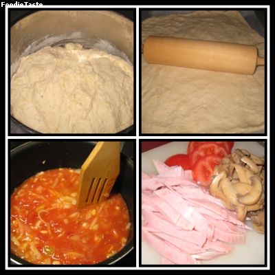 เอาแป้งพิซซ่าที่ได้มานวดแผ่เป็นแผ่น ทาซอสพิซซ่า โรยหน้าด้วยอะไรก็ได้ที่เราชอบ แต่ของเราวันนี้มีแฮม มะเขือเทศ เห็ดแชมปิญองกระป๋อง โรยผงปรุงพิซซ่า ออริกาโน่ หั่นมอซซาเรลล่าใส่บนพิซซ่า โรยเนยแข็งขูดอีกที