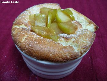 6. แบ่งไข่ขาว 1/3 ส่วน ของทั้งหมดลงในส่วนผสมครีมคัสตาร์ดข้อ 3 ใช้ตะกร้อคนผสมเบา ๆ ให้เข้ากัน แล้วใส่ไข่ขาวอีกทีละ 1/3 ส่วน โดยใช้พายยางตะล่อมเบา ๆ จนเป็นเนื้อเดียวกัน ตักซูเฟลใส้ถ้วยเตรียมไว้ ใช้สเปตูล่าปาดให้เรียบ ใช้นิ้วกรีดด้านข้างจนรอบ นำเข้าเตาอบที่อุ่นไว้ ลดไฟเตาอบเหลือ 200 องศา อบนาน 15-20 นาที นำออกจากเตาอบ โรยหน้าด้วยไอซิ่ง เสริฟร้อน ๆ คู่กับแอปเปิ้ลคาราเมล