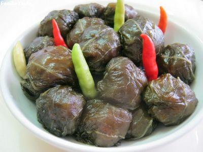 จากนั้นก็ปั้นไส้จะปั้นหรือตักใส่ใบผักกาดดองประมาณ 1 ช้อนชาห่อด้วยใบผักกาดดอง