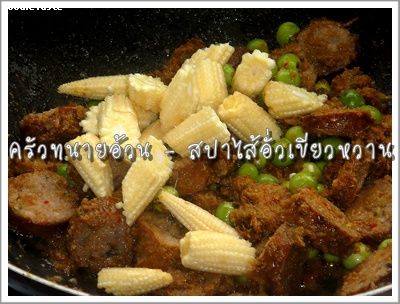 Heat up the sufficient amount olive oil in the wok, add green curry paste and stir fry until fragrant. Add Sai Auo and stir well.