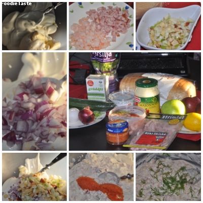 นำมายองเนส และโยเกิต์ผสมกันให้ได้ที่ เติม กุ้ง แฮม แอปเปิ้ลสัป หอมแดงสัปแล้ว คนให้เข้าที ตามด้วย ไข่ปลา และ ผัก Dill เป็นอันเสร็จขั้นตอนแรก แล้วนำมาป้ายขนมปังเป็นชั้นๆ 4 ชั้นกำลังสวยคะ