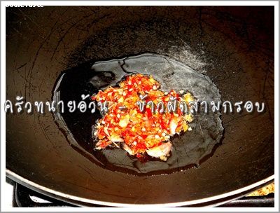 Preheat the wok, add a little bit of oil and add chilies and garlic that pounded together to stir fry until fragrant. Add stale rice, season with sugar and seasoning sauce and mix well.
