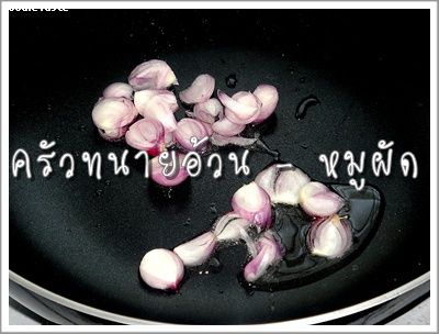 1. ตั้งกระทะให้ร้อน ใส่น้ำมันลงไปนิดหน่อย ใส่หอมแดงซอยละเอียดนิดหน่อยลงไปผัดจนสุกหอม และมีลักษณะใส ใส่หมูลงผัด หรี่ไฟลงเป็นไฟกลาง