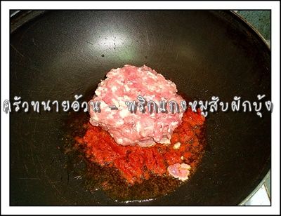 Preheat the pan, add sufficient amount of oil and add red curry paste to stir fry over medium heat until fragrant. Add minced pork to stir fry until mixed thoroughly.