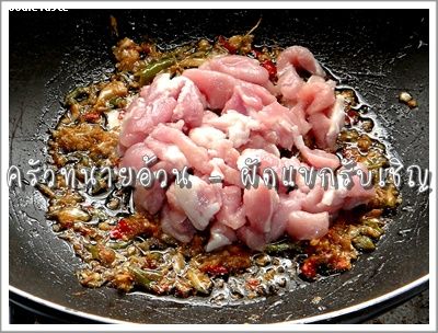 1. ตั้งกระทะให้ร้อน ใส่น้ำมันเล็กน้อย พอน้ำมันร้อนใส่พริก กระเทียมตำลงไปผัดให้หอม ใส่หมูลงผัดพอสุก