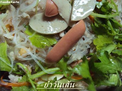 วุ้นเส้นที่เราใช้ไม่ต้องแช่น้ำ นำล้างผ่านน้ำและลวกน้ำเดือดและผ่านน้ำเย็น เส้นจะเหนียวนุ่ม และไม่ติดกัน เราจะใส่วุ้นเส้นไม่เยอะมากเพราะวุ้นเส้นจะอมน้ำต้องใส่น้ำยำให้มากหน่อย