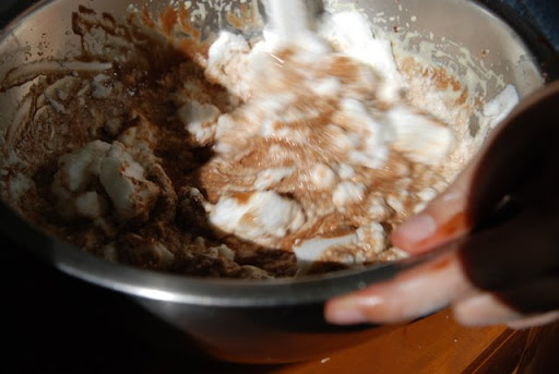 8. ตามส่วนชอกโกเล็ตลงไปอีกครึ่งนึงค่ะ สาเหตุที่ต้องแยกกันเพราะว่า ถ้าใส่แป้งก่อนเลย ส่วนผสมจะเหนียวหนึึบเกินไป ใส่สลับกันถึงจะเข้ากันดีค่ะ