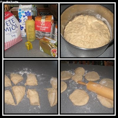 ละลายมาร์การีนโดยใส่หม้อตั้งไฟจนละลายหมด เติมนมสด เอาแค่อุ่นๆ ยกหม้อออกจากเตา ขยี้ยีสต์ใส่ไป เติมเกลือ ไซรัฟ ใช้ตระกร้อมือตีให้ยีสต์ละลายหรือใช้เครื่องปั่นก็ได้ เติมแป้งสาลี ของเราใส่แป้งสาลี 15 เดซิลิตร แป้งกรอแฮม 3 เดซิลิตร ค่ะ ชอบนอกตำรา ใช้มือผสมจนแป้งกับน้ำเข้ากันดี ผ้าคลุมไว้ ปล่อยยีสต์ทำงาน 30 นาที