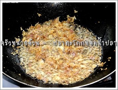 2. เทน้ำมันออกให้หมด ใส่น้ำมันใหม่ลงไป เจียวกระเทียมให้เหลืองกรอบ