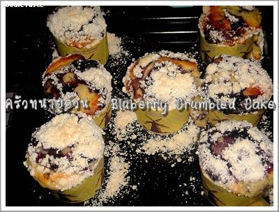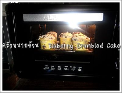 5. ใส่ส่วนผสมลงไป 1/4 ของถ้วย ใส่บลูเบอร์รี่ลงไป 1 ช้อนชา กว่าๆ ใส่ส่วนผสมของเค้กลงไปอีกครั้ง แล้วทับด้วยบลูเบอร์รี่ โรย crumble ให้ทั่วๆ