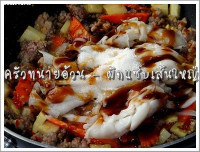 2. ใส่หน่อไม้ต้มหั่นลูกเต๋า แครอท เส้นใหญ่ ปรุงรสด้วยน้ำตาล น้ำปลา น้ำมันหอย ผัดให้เข้ากัน
