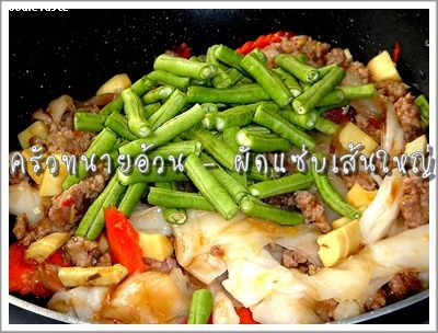 3. ใส่ถั่วฝักยาว ใบมะกรูดฉีก พริกเหลืองซอย และใบโหระพา ผัดให้เข้ากันอีกทีก็ปิดไฟได้