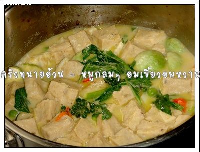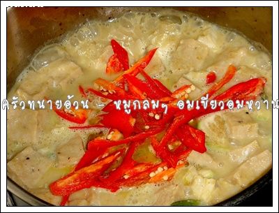 3. ปรุงรสด้วยน้ำตาลปี๊บ น้ำปลา ใส่ลูกชิ้นหมูที่หั่นแล้วลงไป