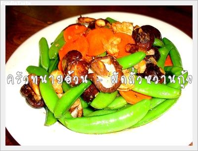 Turn the heat up, add peeled shrimp and stirvfry until shrimps turn pink. Add thinly sliced carrot,sweet pea and fresh skitake mushroom. Season with sugar, fish sauce and oyster sauce and stir well.