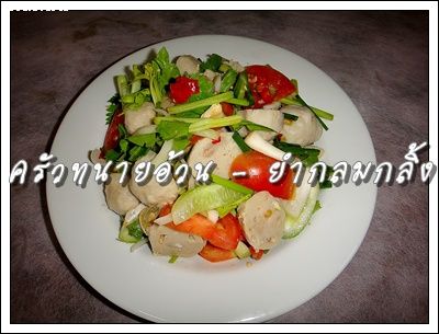 3. ใส่ลูกชิ้นหมู คลุกเคล้าให้เข้ากัน ใส่หอมใหญ่ มะเขือเทศ และแตงกวา คลุกเคล้าให้เข้ากันอีกที