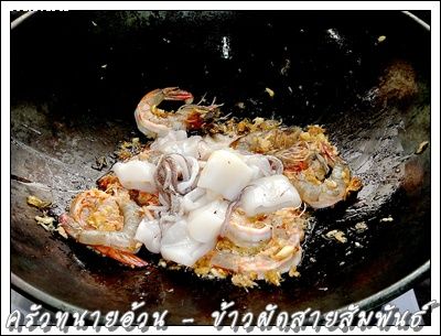 1. ตั้งกระทะให้ร้อน ใส่น้ำมันลงไปเล็กน้อย ใส่กระเทียมสับลงไปผัดบนไฟกลางๆจนหอม ใส่กุ้งลงผัดจนเปลี่ยนสี ใส่ปลาหมึกลงไปผัด