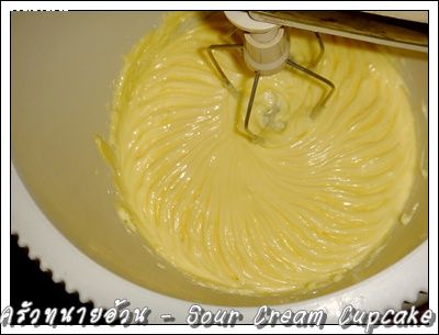 3. ในอ่างผสม ตีเนยจนอ่อนตัว ใส่ น้ำตาลและsour cream แล้วตีให้ฟู ประมาณ 7-9 นาที