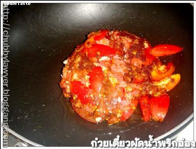 3 ปรุงรสด้วยน้ำตาลปี๊บ น้ำปลา น้ำมะขามเปียก ผัดต่อบนไฟกลางๆ จนกว่าน้ำพริกเกือบแห้ง