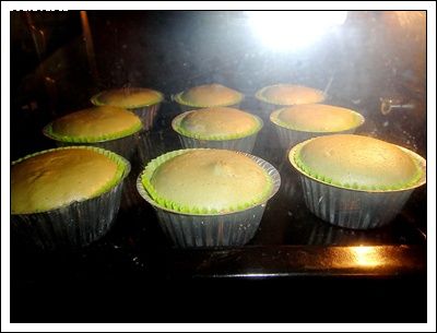 6. ตักส่วนผสมเค้กลงในถ้วยกระดาษ ประมาณ ¾ ของถ้วย นำเข้าอบ 20-25 นาที