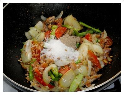 Preheat and grease the wok with the sufficient amount of vegetable oil (approximately 4-6 tbs.). Add salted fish to stir fry over medium heat until light brown in both sides. Use the spatula the chop fried salted fish into smaller pieces and continue to stir fry until salted fish are crispy.
