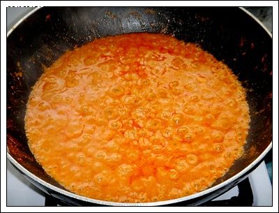2. ตักเอาแต่กะทิส่วนข้นๆ ใส่กระทะใบใหม่ ตั้งไฟให้เดือดอีกครั้ง ใส่น้ำพริกแกงคั่วลงผัดให้หอมบนไฟปาน