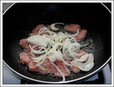 Preheat and lightly grease the wok with vegetable oil, add half of North – Eastern style preserved minced pork to stir fry until cook. Add tomato and onion to stir fry until incorporated.