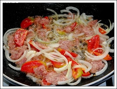 1. ตั้งกระทะให้ร้อน ใส่น้ำมันลงไปเล็กน้อย ใส่แหนมหมูครึ่งนึงลงผัดจนสุก ใส่มะเขือเทศ หอมใหญ่ ผัดต่อจนหอมใหญ่สุกนิ่ม