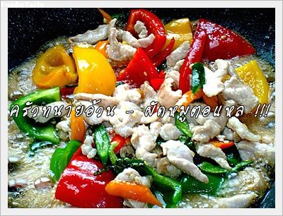 1. ผัดเนื้อหมูหั่นบางๆในน้ำมันร้อนๆ พอหมูสุกใส่พริกทั้งหมดลงไป