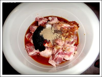 1. หมักกระดูกหมู กระเทียมสับ ซอสฮอยซิน เต้าเจี้ยว ซอสปรุงรส และน้ำมันงา คลุกเคล้าให้เข้ากัน ทิ้งไว้ในตู้เย็นประมาณครึ่งชั่วโมง