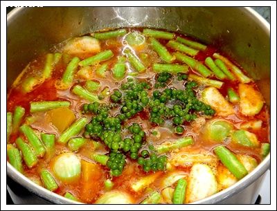 4. ใส่มะเขือเปราะ ถั่วฝักยาว พอเดือดอีกครั้งใส่พริกไทยอ่อนและใบกะเพรา ปิดไฟได้