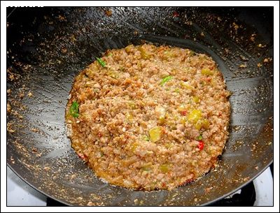 3. ใส่หมูสับ ตะลิงปิงที่เหลือ ผัดจนทุกอย่างเข้ากันดี และมีลักษณะค่อนข้างแห้ง