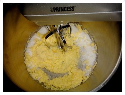 3. ใส่เนยสดและน้ำตาลทรายลงในอ่างผสม ตีผสมด้วยหัวตีใบไม้โดยใช้ความเร็วปานกลาง ประมาณ 10 – 12 นาที หรือจนส่วนผสมขึ้นฟูเป็น 2 เท่า