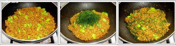 2. ใส่หมูสับลงผัดให้เข้ากัน คั่วกลับไปกลับมาจนหมูสุกดี ปรุงรสด้วยน้ำตาลทรายและน้ำปลา