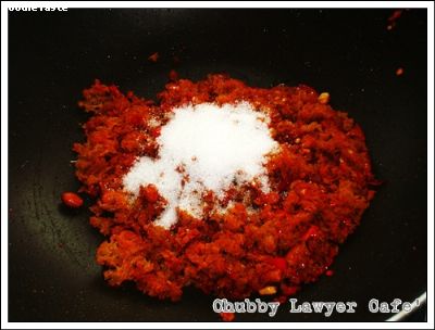 โขลกพริกแห้งกับเกลือเข้าด้วยกันจนละเอียด ใส่ส่วนผสมที่เหลือ ทั้งหมดลงไป โขลกรวมกันจนละเอียดและเข้ากันดี