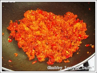 Stir fry red curry paste in slighty oiled wok over medium heat and continue to stir fry until red curry paste fragrant. Add pla duk fu (deep fry catfish meat).