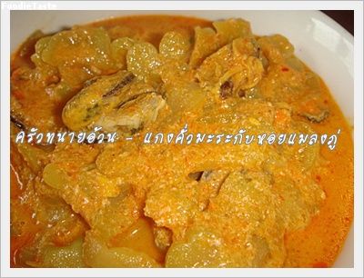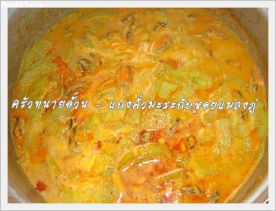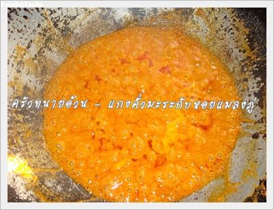 2. เคี่ยวต่อบนไฟกลางๆให้แตกมันนิดหน่อย ใส่หอยแมลงภู่ และปรุงรสด้วย น้ำตาลปี๊บ น้ำปลาดี