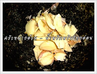 1. โขลกกระเทียมให้ละเอียด ใส่กะปิลงไป