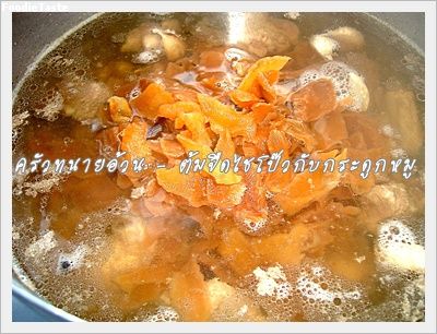 2. พอกระดูกหมูเปื่อยดี ใส่ไชโป๊วหั่นตามขวางบางๆ เคี่ยวต่อบนไฟอ่อนไปเรื่อยๆ จนกว่าไชโป๊วจะบานเต็มที่ ลองชิมรสดู อาจเติมน้ำปลาได้นิดหน่อย