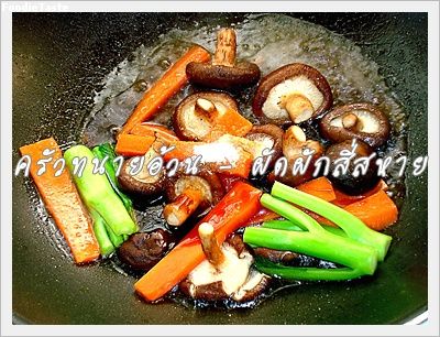 1. ลวกแครอทในน้ำเดือดจัดๆ ตามด้วยก้านคะน้า และเห็นหอมสด