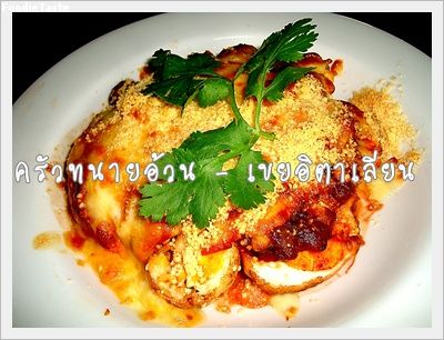 5. ตักราดไข่ที่ทอดเตรียมเอาไว้ โรยทับด้วนมอสซาเรลล่าชีส และพามิซานชีส นำเข้าอบไฟแรงๆ ประมาณ 15 นาที Top the deep fried eggs that halved and sprinkle with mozzarella and parmesan cheese. Put in very high heat oven for 15 minutes