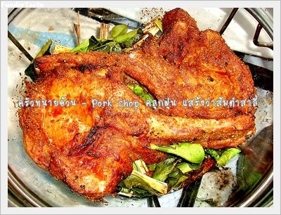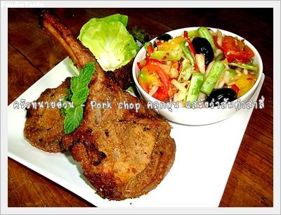 Roughly mix the lemon grass , galangal and kaffir lime leaves in baking tray. Place pork chops over the mixed herb and sprinkle with marinating and olive oil. Put in medium high oven for 15 – 20 minutes.